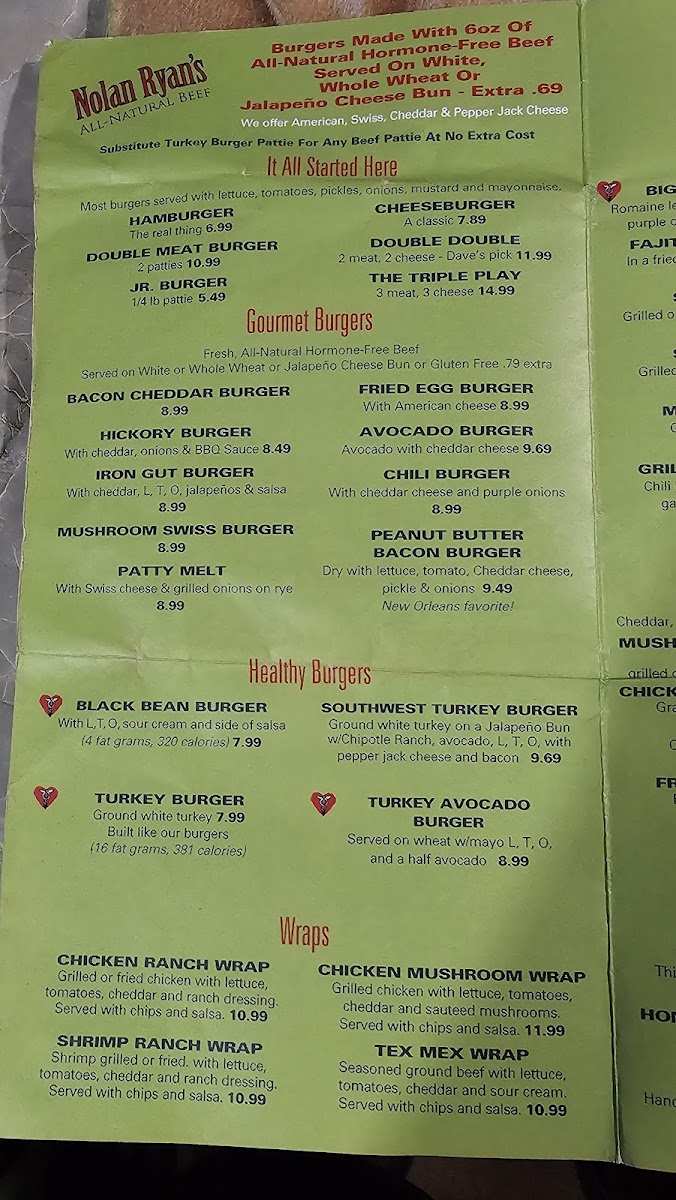 The menu showcases a delightful variety of wraps, including the Shrimp Ranch Wrap and Chicken Ranch Wrap, both generously filled and served with crispy chips and zesty salsa for just $12.97. For those craving something more indulgent, the Triple Play Burger packs a sizable punch with three meats and three cheeses, while the classic cheeseburger remains a staple favorite.